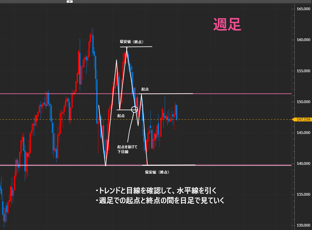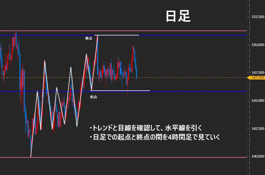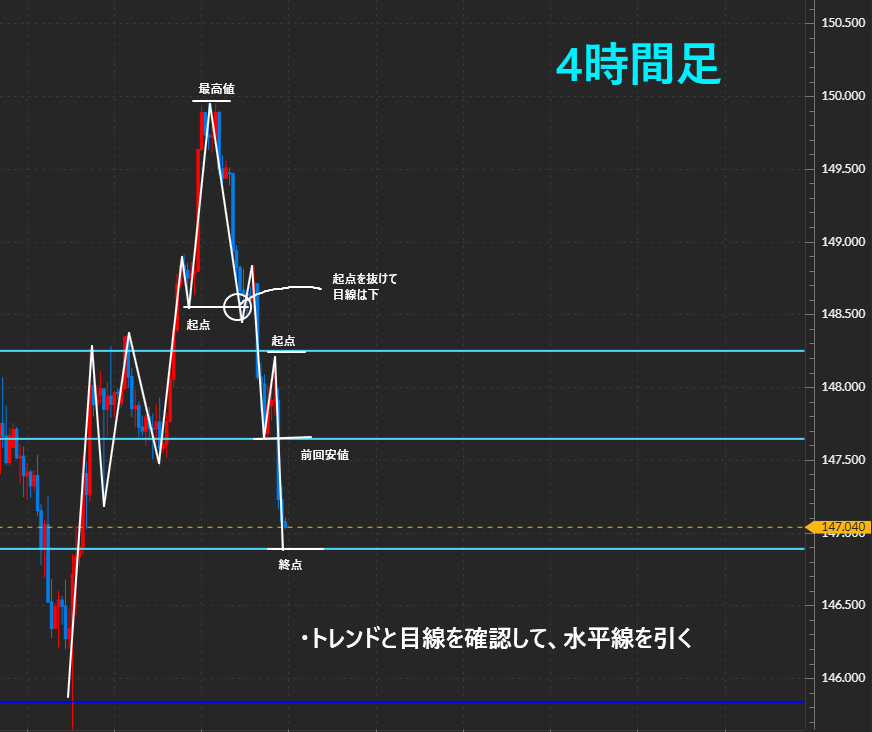 必要な水平線は各時間足で起点、終点、前回安値or前回高値。