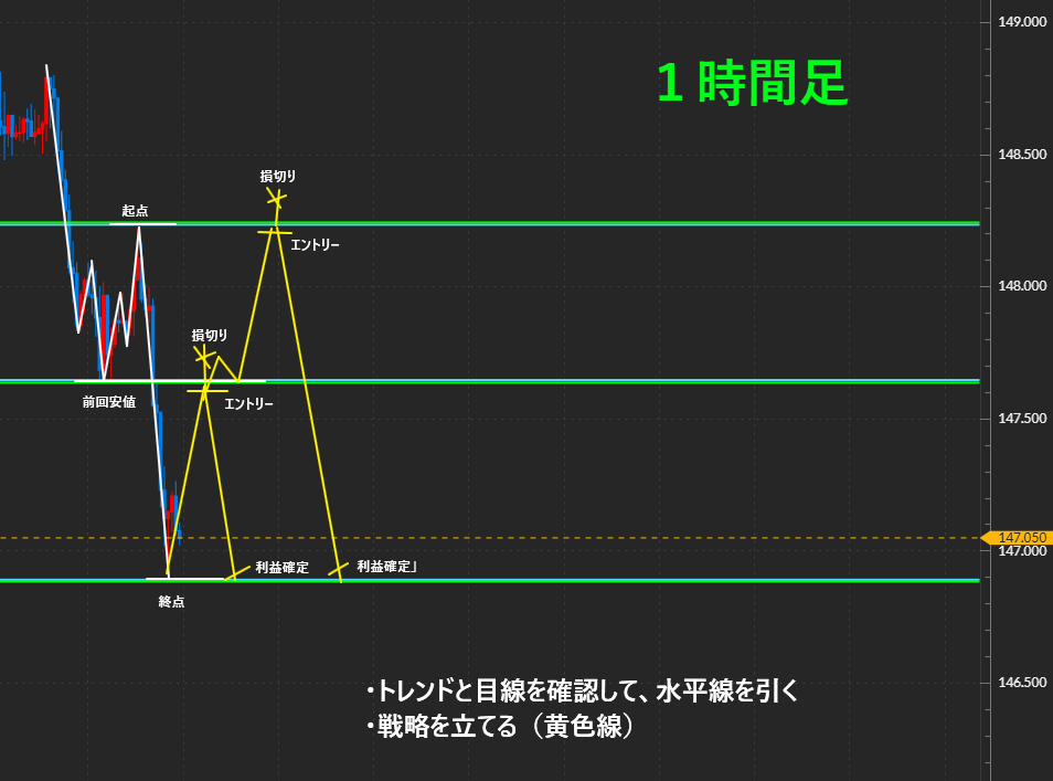 1時間足まで落としたら、黄色線みたいにエントリー、損切り、利益確定の場所を決めて戦略を立てます。