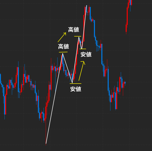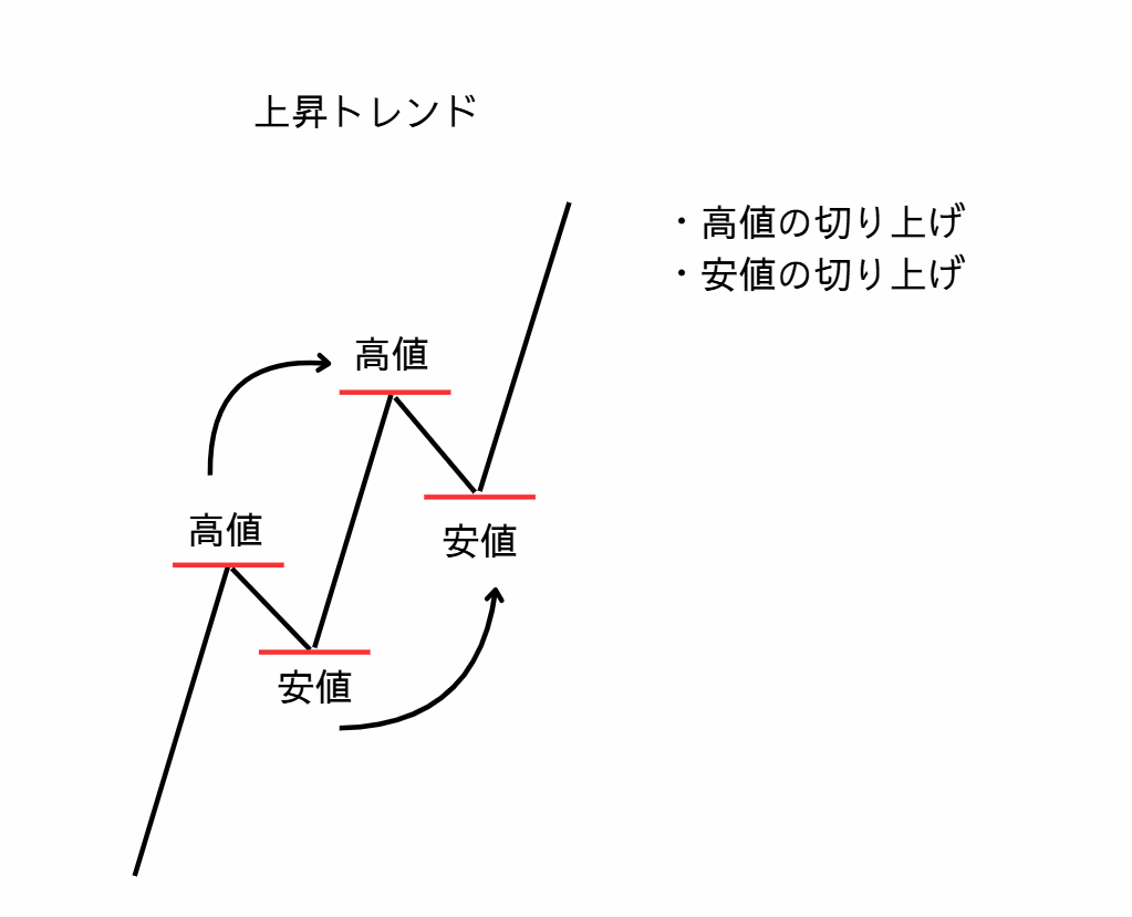 上昇トレンド=「高値」と「安値」が”切り上がっている”状態。
