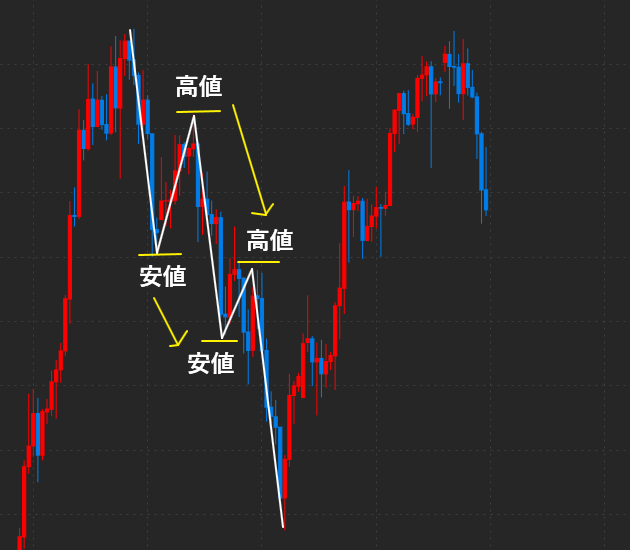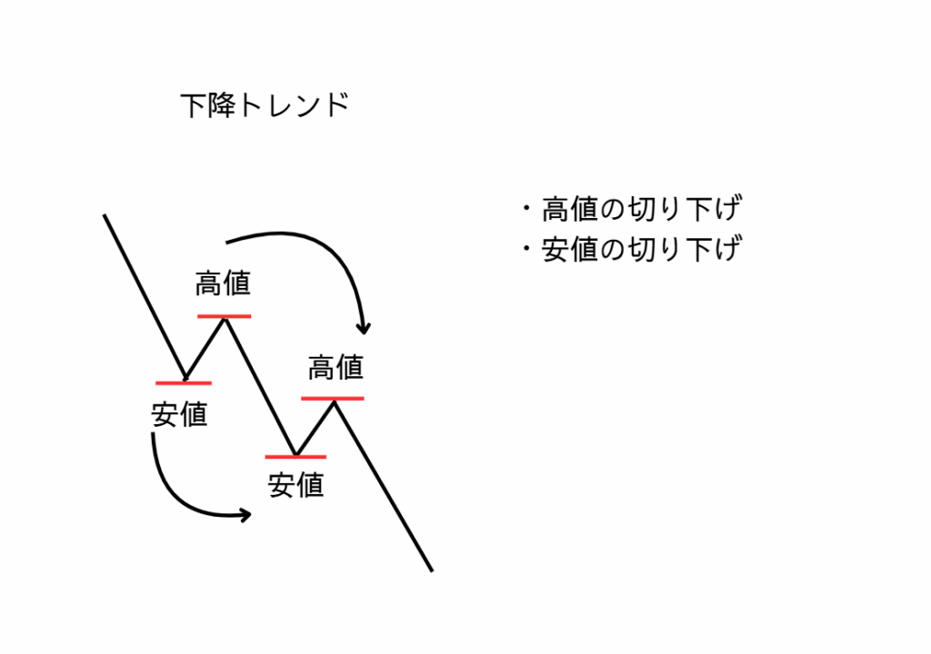 下降トレンドトレンド=「高値」と「安値」が”切り下がっている”状態。
