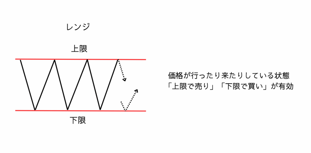 レンジ=「高値」と「安値」の位置がほとんど変わらず価格が行ったり来たりしている状態