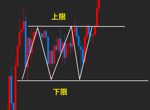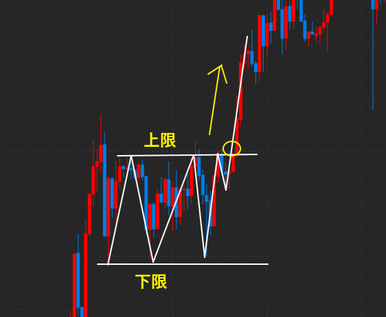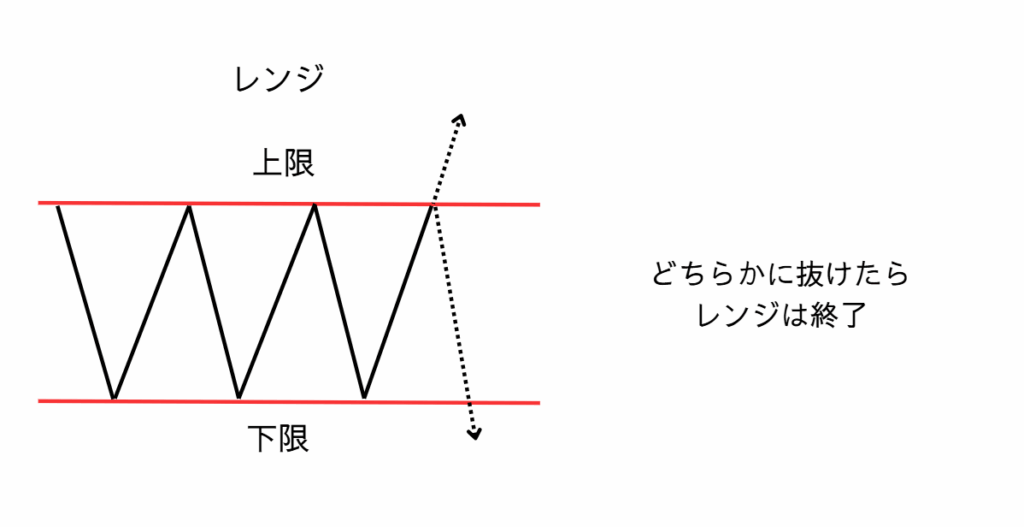 レンジは「上限」or「下限」をどちらかに抜けてローソク足が確定したら終了します。
