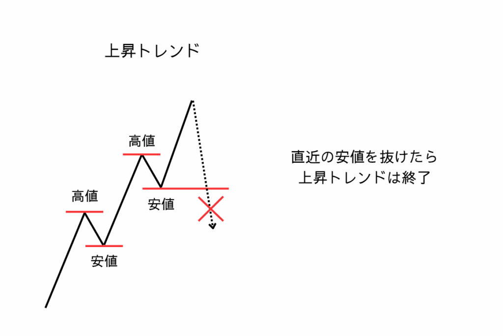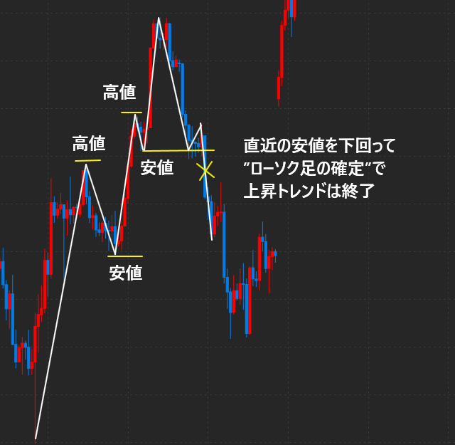 上昇トレンドは「直近の安値」を下に抜けてローソク足が確定したら終了します。