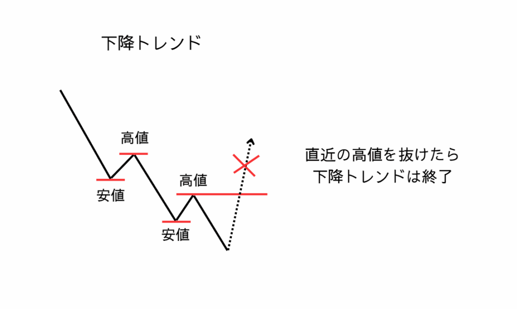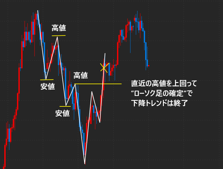 下降トレンドは「直近の高値」を上に抜けてローソク足が確定したら終了します。