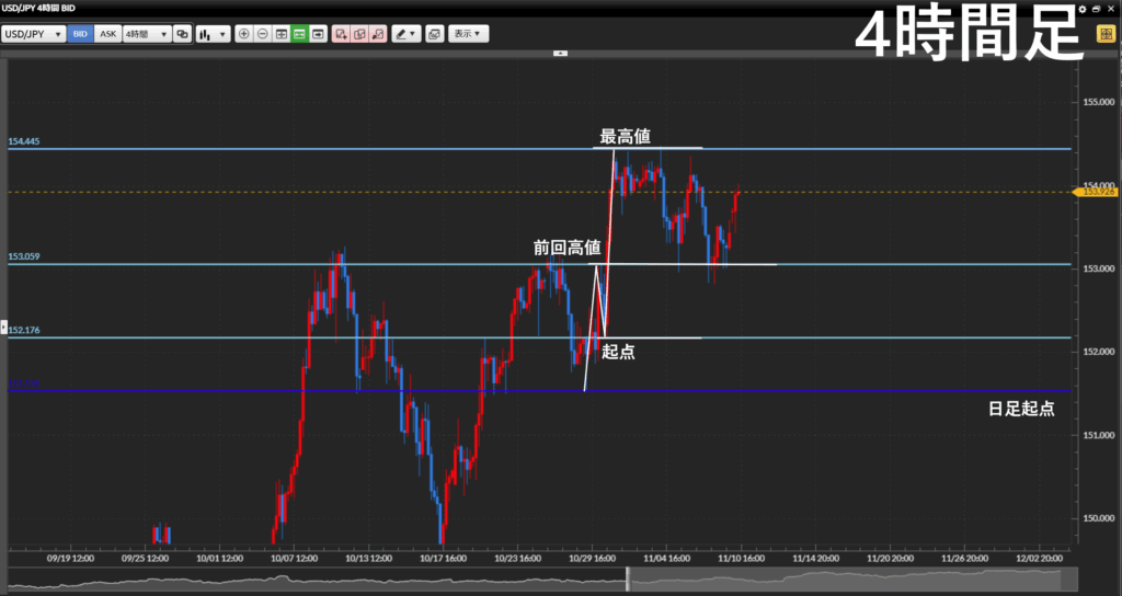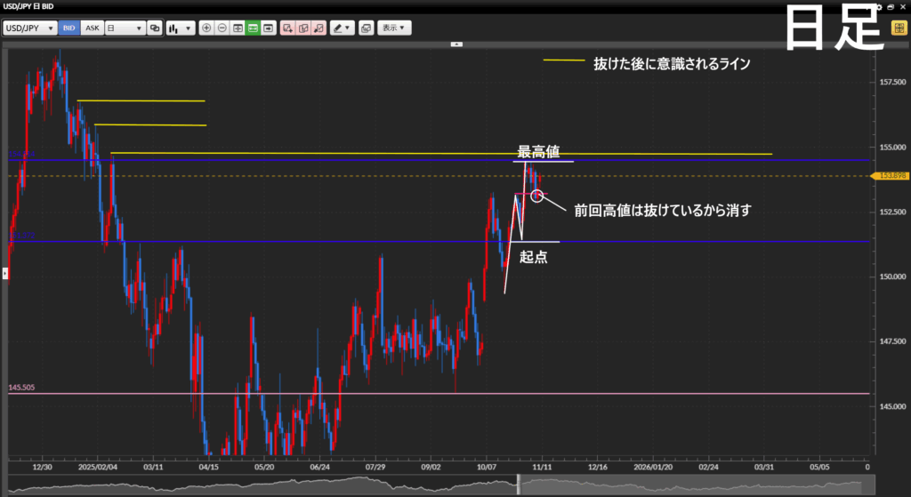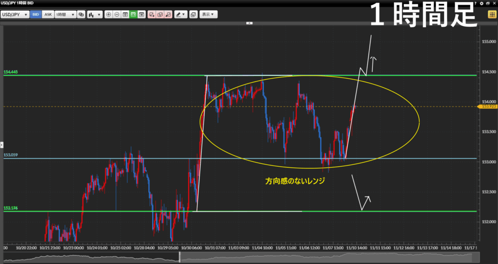 前回高値は何度も抜けているので、1時間足では引きません。