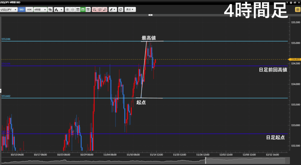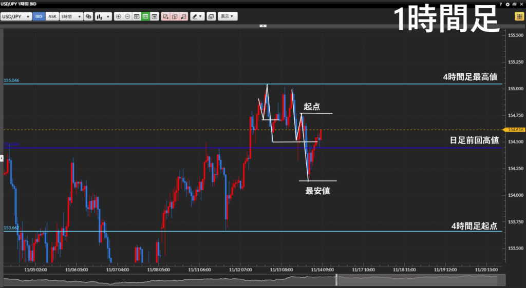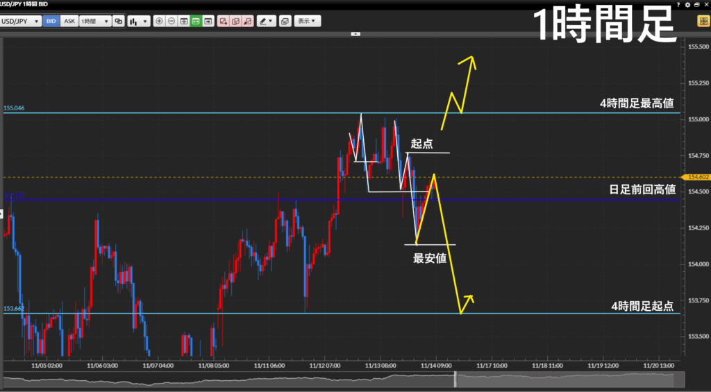 1.4時間足の起点に引き付けて、5分足の下降の波が崩れたらエントリー