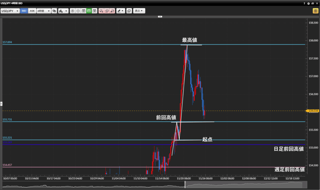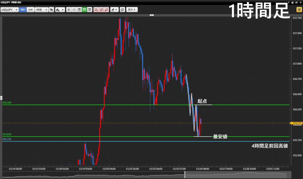 ②4時間足の起点で5分足の下降が崩れたらエントリー