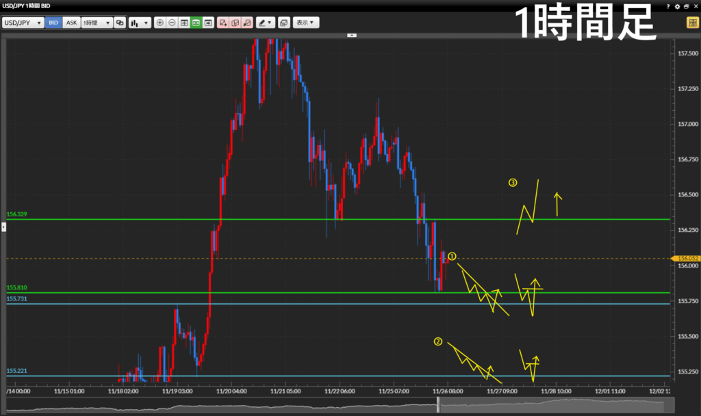 ①4時間足前回高値で5分足の下降が崩れたらエントリー