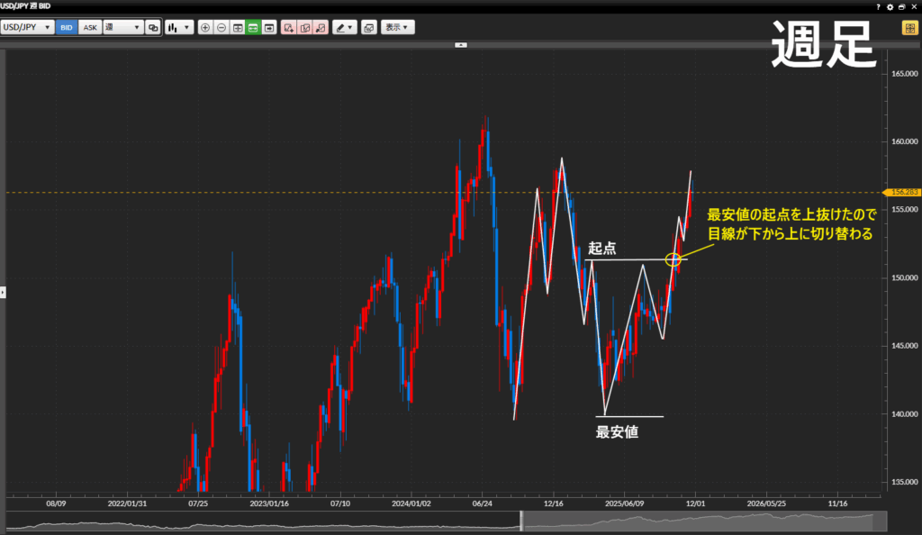 ・週足では、市場全体の大きな流れやファンダメンタル(経済的な要素)の影響も含めた本物の流れが見えてきます。