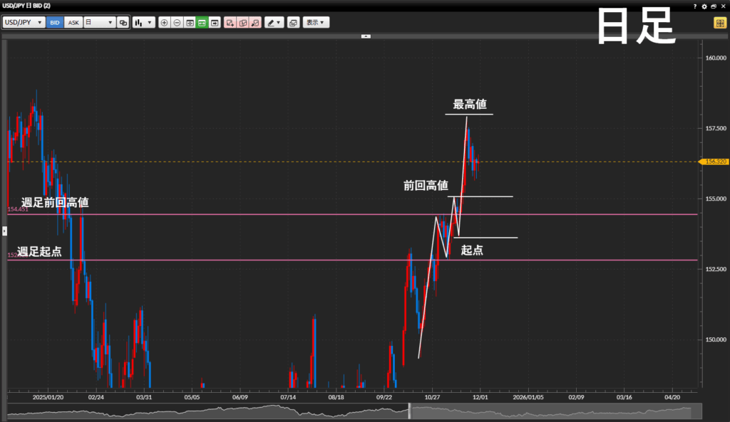 ・週足と方向が同じなら「推進波」、逆なら「調整波」と見ます。