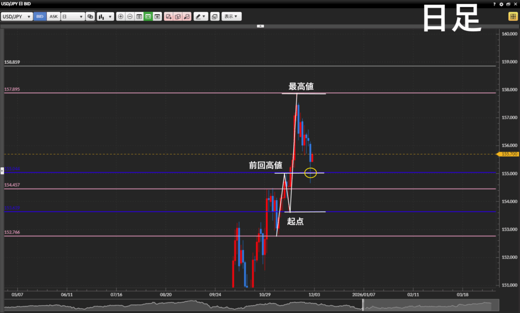 ・最安値の起点まで上がってきて、起点が意識されている状況。