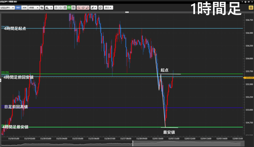 ①1時間足の起点で5分足が下目線に切り替わってからエントリー。