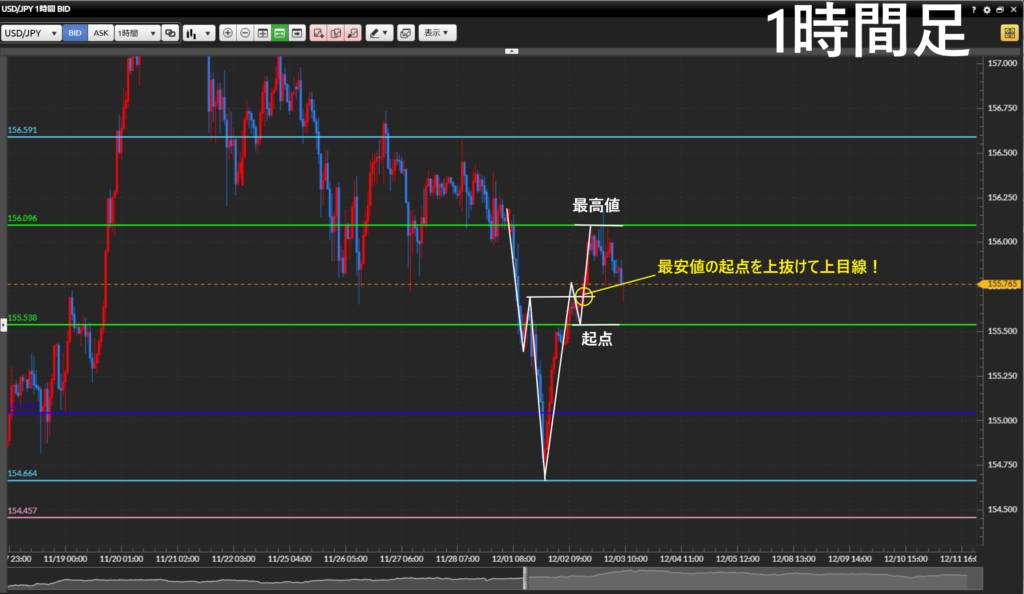 ①1時間足の起点まで引き付けて、5分足の下降が崩れたらエントリー。