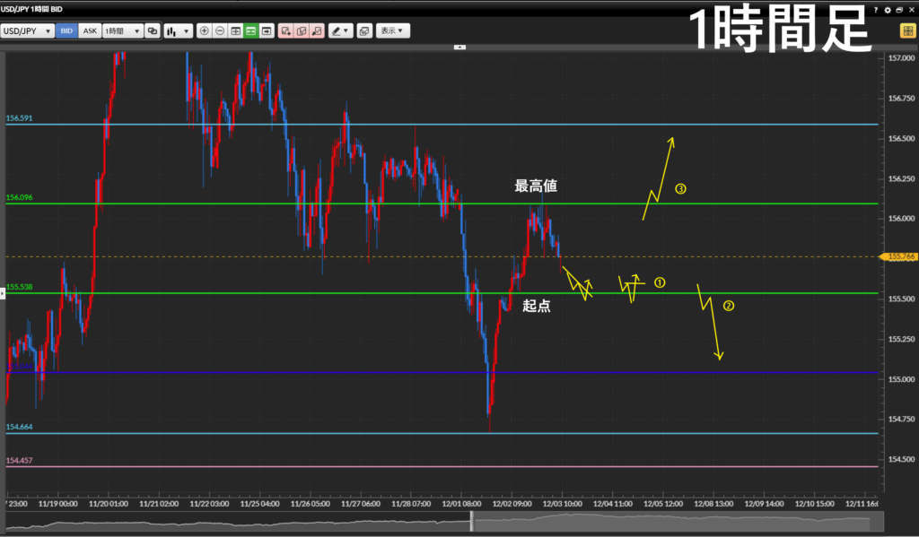 ・1時間足に従って、起点まで落ちてきた時に「買い」で狙っていきたい