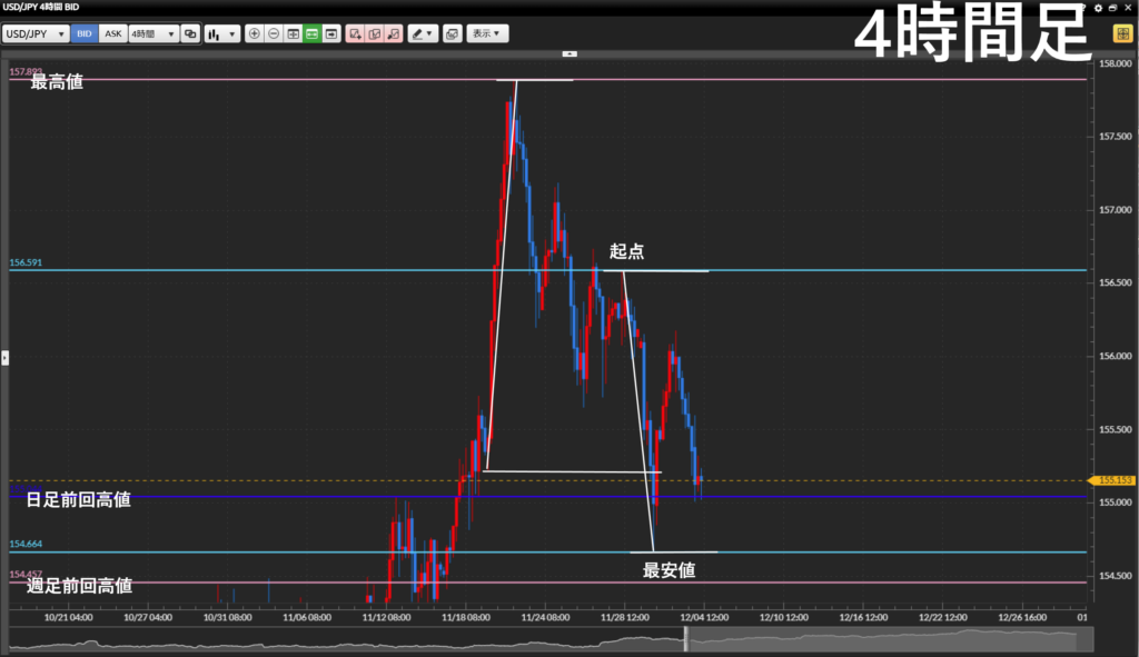 ・最安値を抜けたら、4時間足の最安値まで狙っていく。