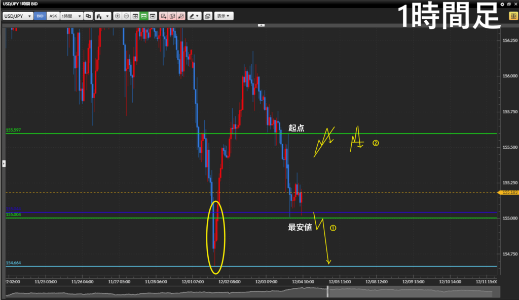 ①1時間足の最安値を抜けたタイミングで5分足でエントリー