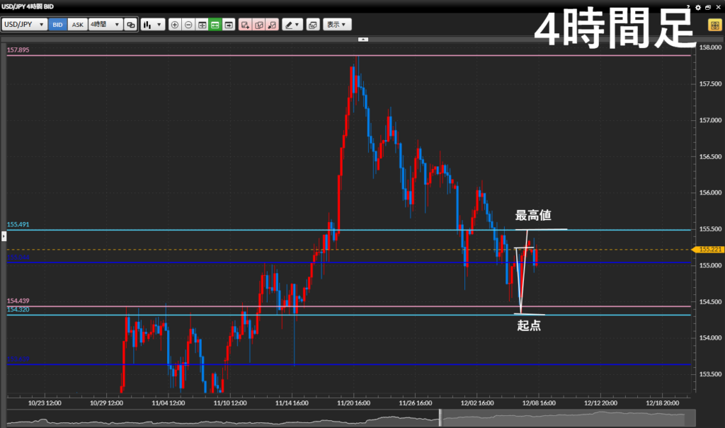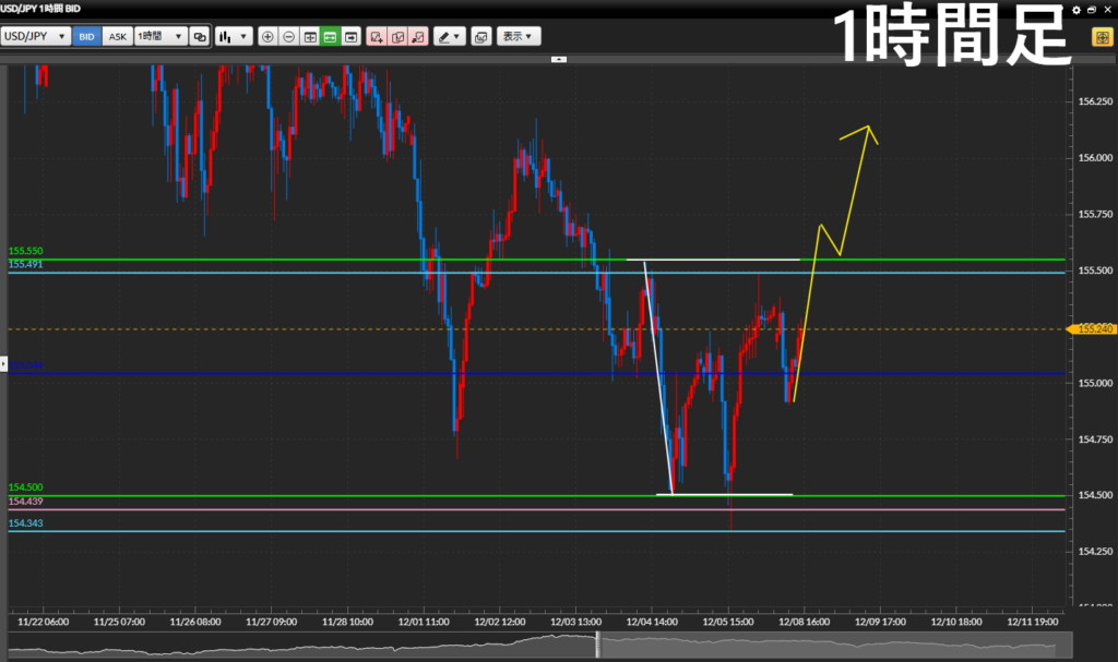 1時間足の起点(緑)を上に抜けて、4時間足と目線が揃った所を狙っていく。