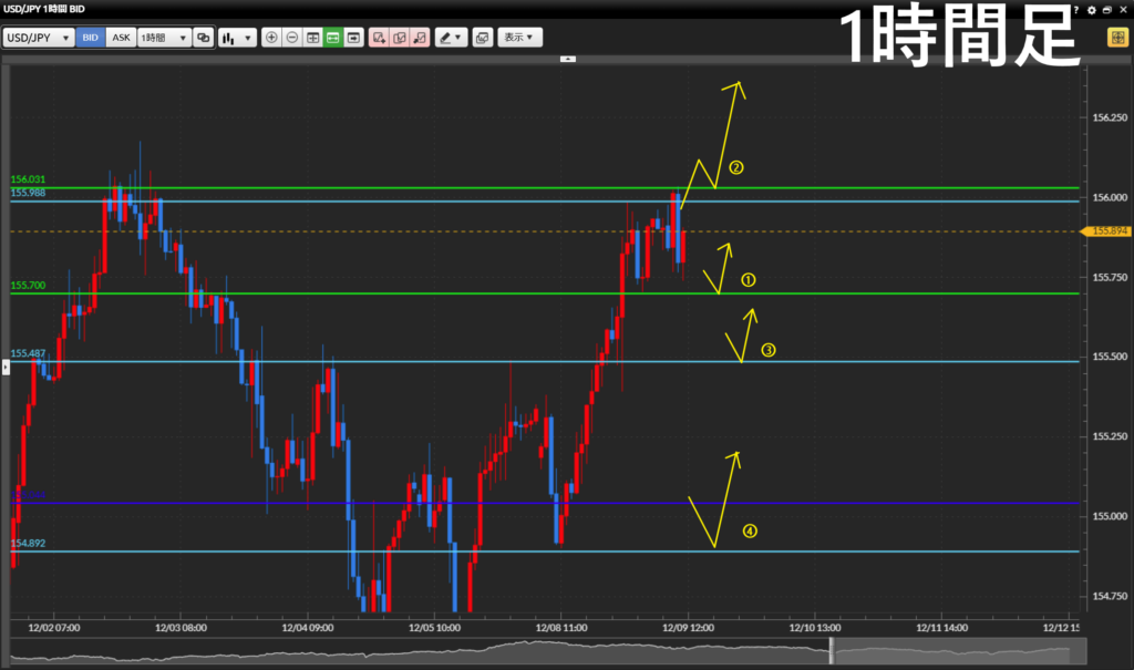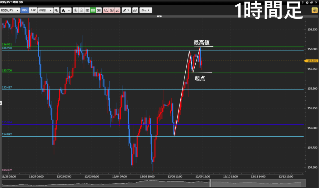 ①1時間足の起点で5分足の下降が崩れたらエントリー。