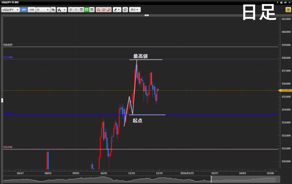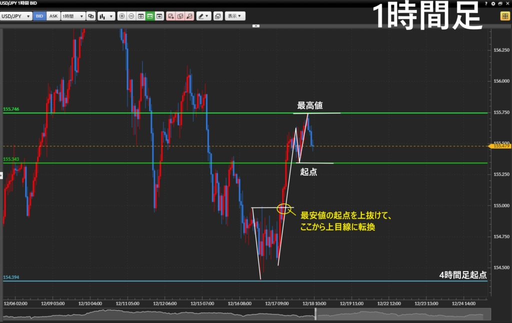 ・1時間足の起点まで引き付けることで、「損切りを狭く・利幅を広く」できる