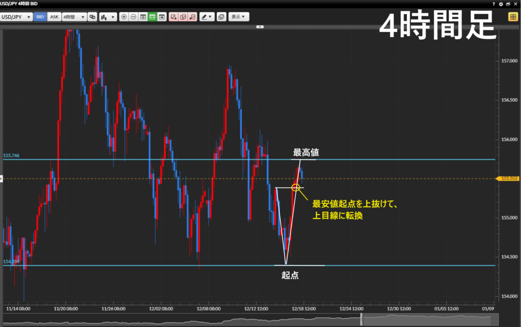 ②4時間足の起点まで引き付けて、5分足の下降が崩れたらエントリー。