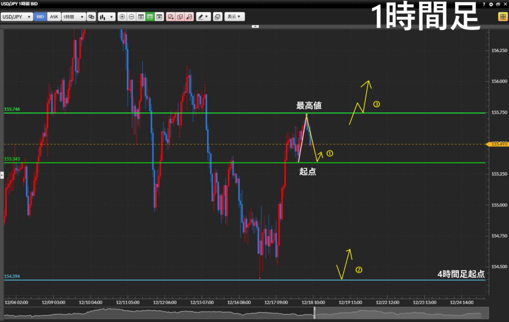・起点まで引き付けたいが値幅が広いので、1時間足に落として見る。
