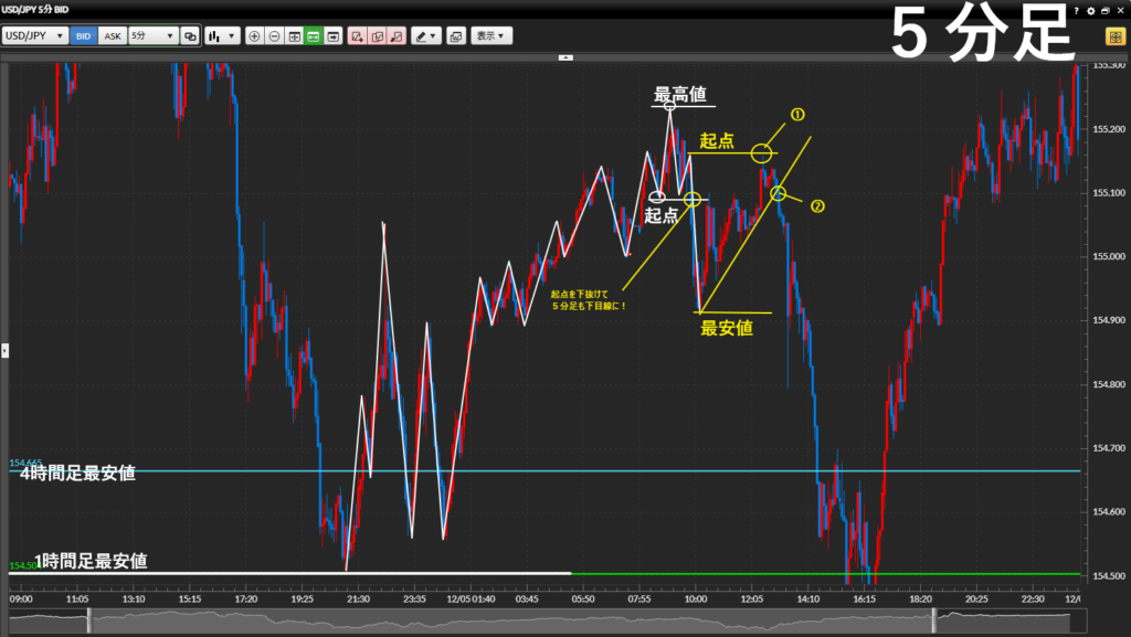 ①5分足で目線が切り替わった後に起点まで引き付けて売りエントリー。