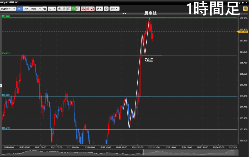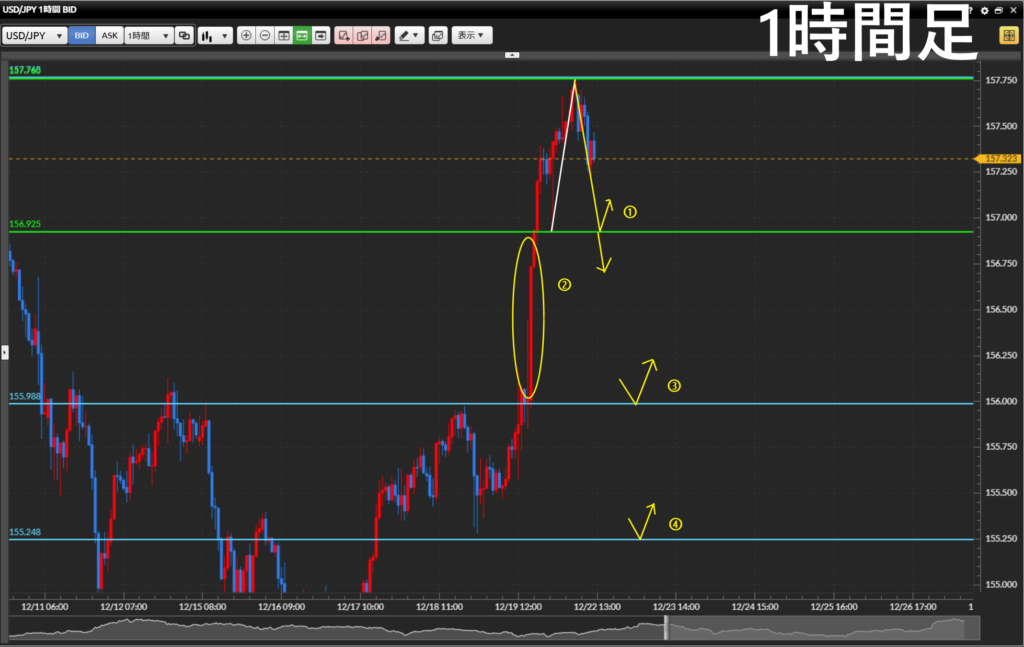 ②1時間足の起点を下抜けて確定した場合、左の上昇部分を狙ったショート(売り)エントリー